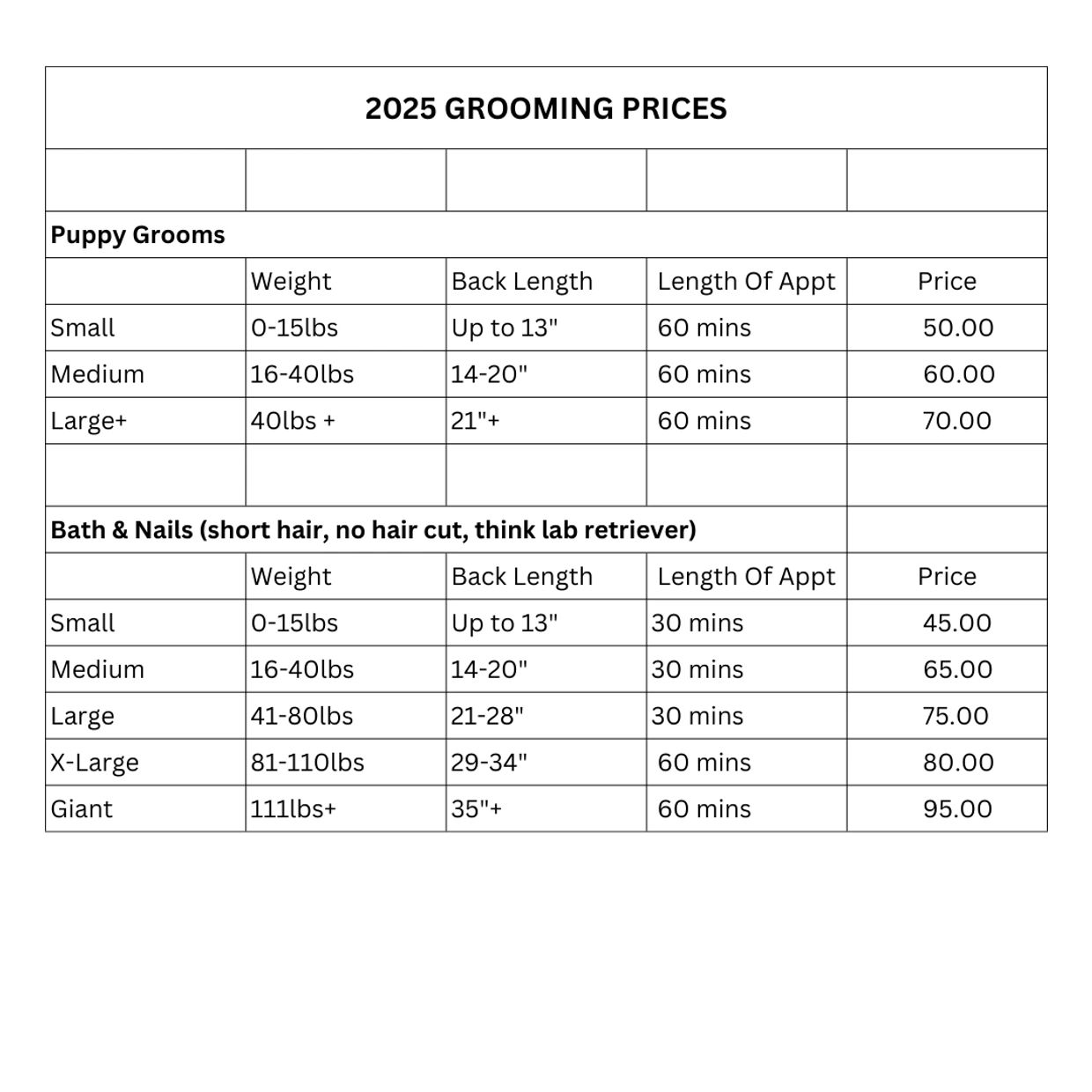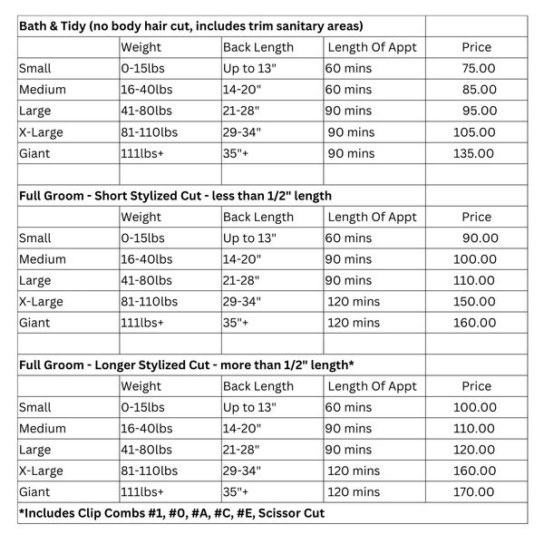 Prices start at the published rate but are subject to change based on dog size (weight & height), breed, condition of the coat, behaviour (on table) and difficulty of stylized cut. Dog will be assessed at our salon and priced accordingly.